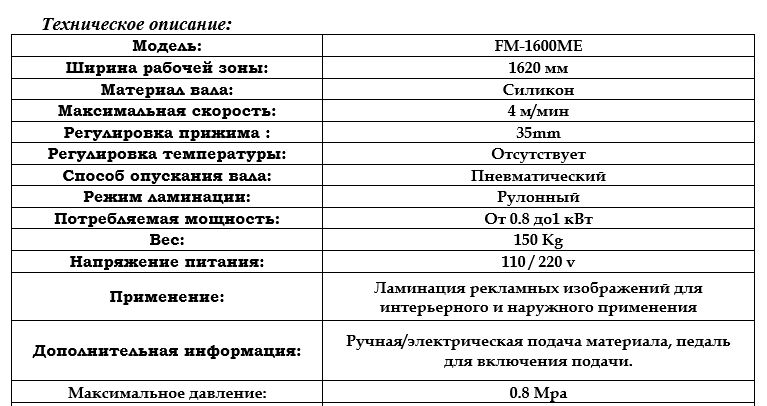 Ламинатор FM-1600ME это односторонний холодный широкоформатный ламинатор . Характеризуется надежностью и удобством в эксплуатации . Оборудование гарантирует стабильный результат и низкие затраты. Данное оборудование является лучшим бюджетным вариантом для принт-центров специализирующихся на широкоформатной печати, мобильных выставочных конструкциях, наружной и интерьерной рекламе и т.д. с небольшими и средним объемом работы. FM-1600ME это надежный и экономичный ламинатор, который имеет широкие возможности, удобства в работе и необходимый набор функций для стабильной и качественной рулонной ламинации.