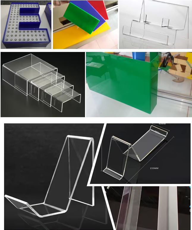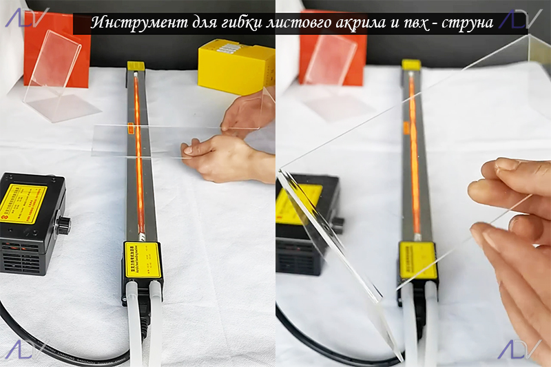 Инфракрасная струна разогревает материал, смягчает и поддает сгибу используемый материал. Гибочный станок широко используется в изготовлении вывесок, рекламных дисплеев, букв для светодиодных лайтбоксов , тейбл-тентов ( менюхолдеров ) акриловых рамок , визитниц, акриловых подставок, стендов, рекламных щитов и многое другое. Существенно экономит время.