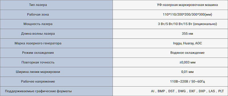 Ультрафиолетовый лазерный маркировщик, имеет длину волны 355 нм, что позволяет образовывать малое пятно в точке фокуса лазерного луча, размер которого достигает 0,004 мм. Благодаря этому данное оборудование гравирует практически на всех доступных материалах и поверхностях.